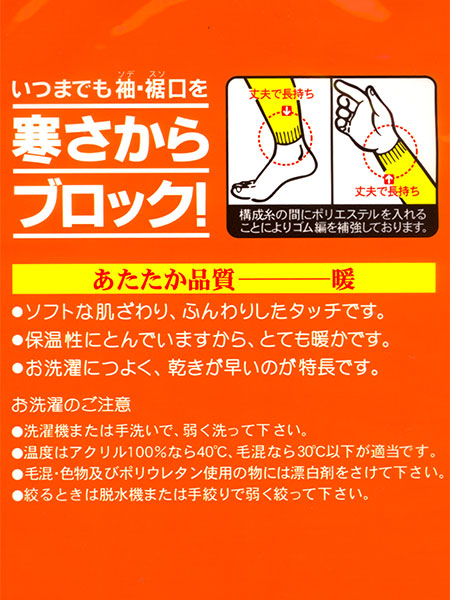構成糸の間にポリエステルを入れることによりゴム編を補強しているので、袖口が丈夫で長持ち。