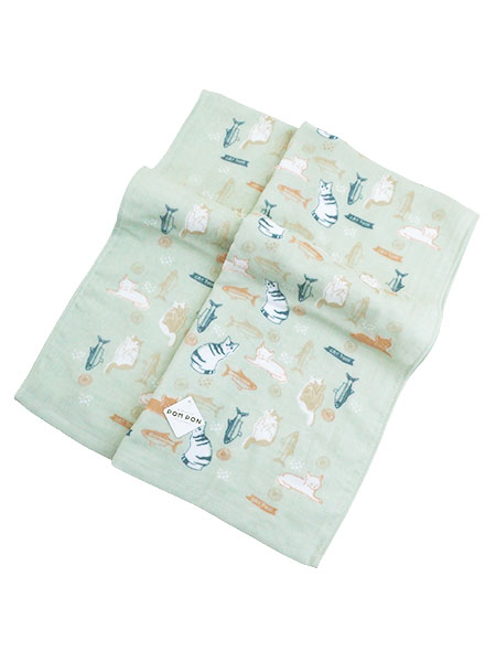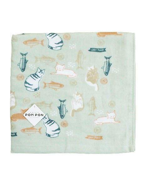 POM PON、ポンポンフレンズのバスタオル、チルキャット、プリント、表ガーゼ裏パイル。