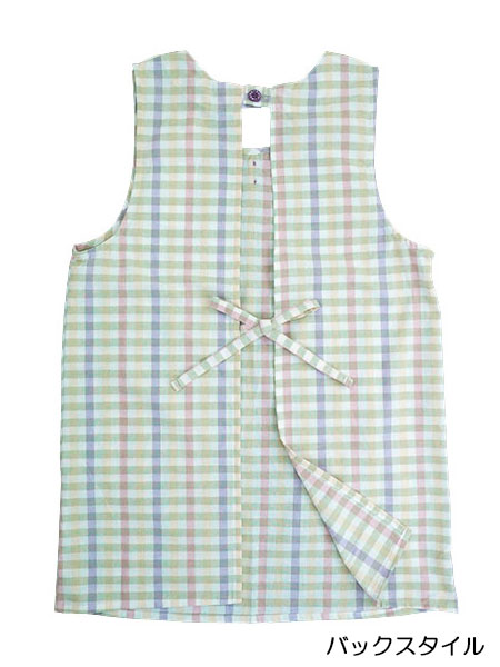 後ろは首元ワンボタン留め、ウエストひも調節となります。