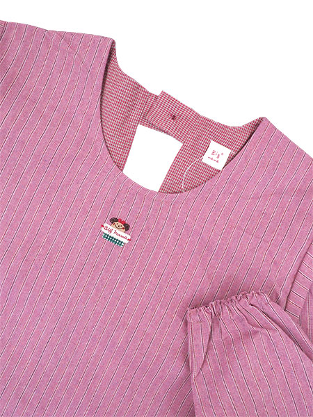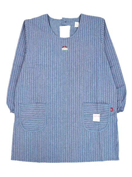 胸元にかわいいビッグママのワンポイントが付いたストライプ柄の割烹着。