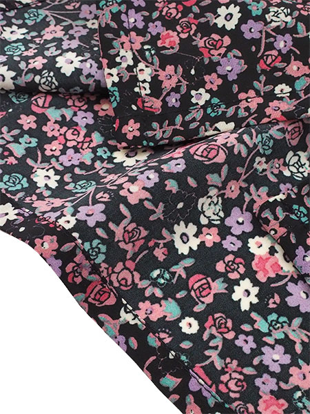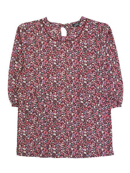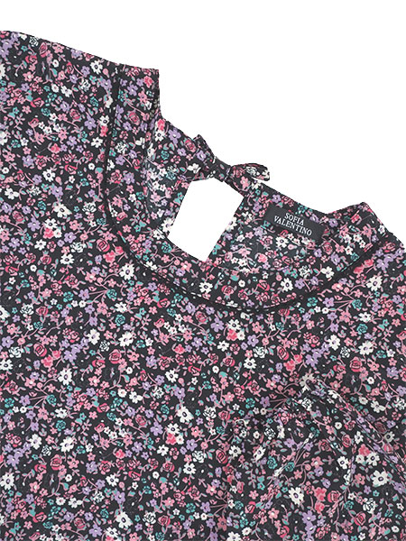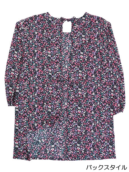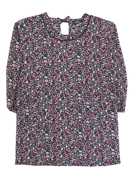おしゃれな小花柄プリント。襟ぐりに同系色のレースの飾り付き。