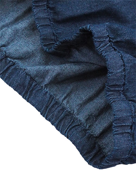 裾部分、平ゴム入りギャザー仕様。前に左右にパッチポケット付き。