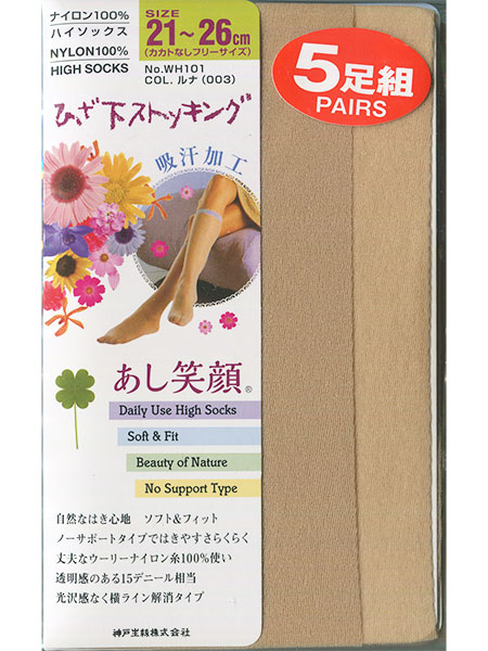 コベス あし笑顔 レディースひざ下ストッキング 5足組。かかとなしのフリーサイズです。