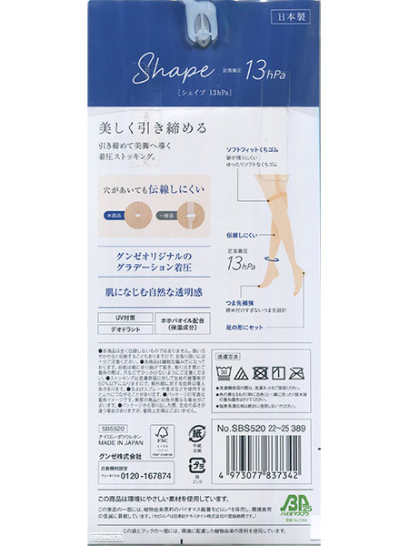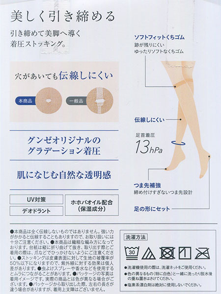 グンゼオリジナルのグラデーション着圧。足首着圧13hPa。肌になじむ自然な透明感。