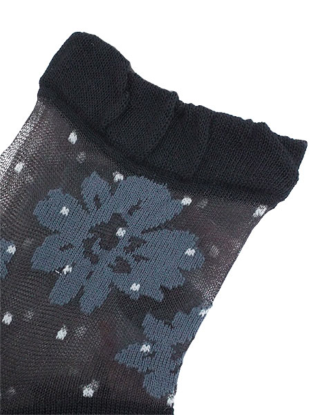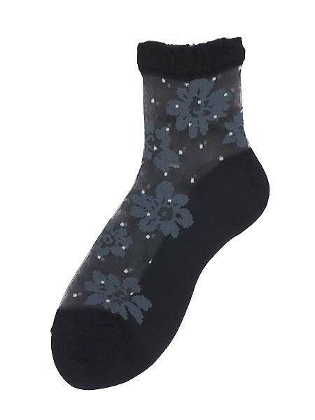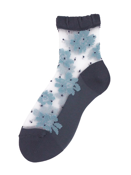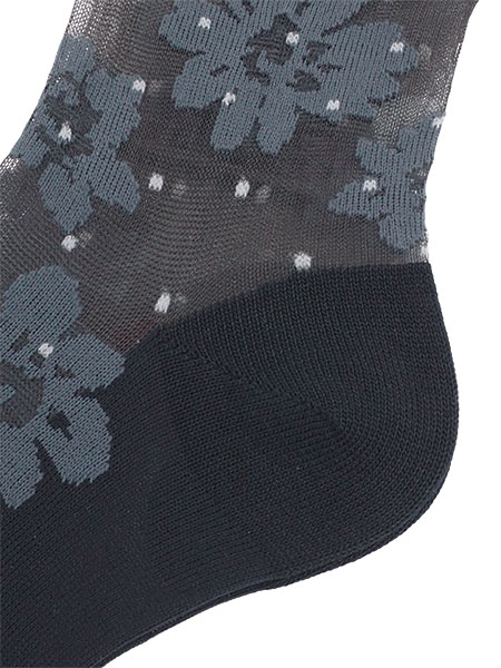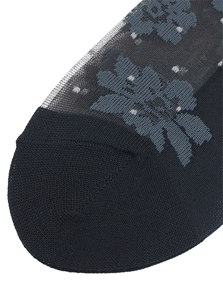 シースルー部分に花とドット柄がデザインされた、足底付きの日本製靴下。