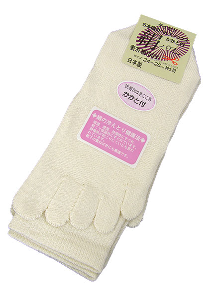 五本指のヘルスソックス かかと付 絹パワー 絹の冷え取り健康法・吸湿、透湿、放湿性に優れ、軽くて保温性に優れています。重ねばきをすると比較的長持ちします。(この上にもう一枚、他の素材のものを重ねる)