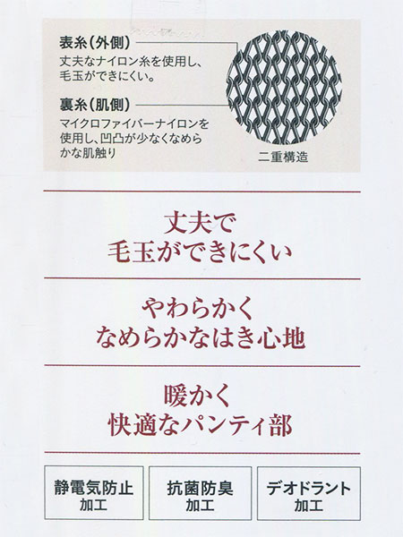 丈夫で暖かい二重構造。はき心地がなめらかなタイツ。