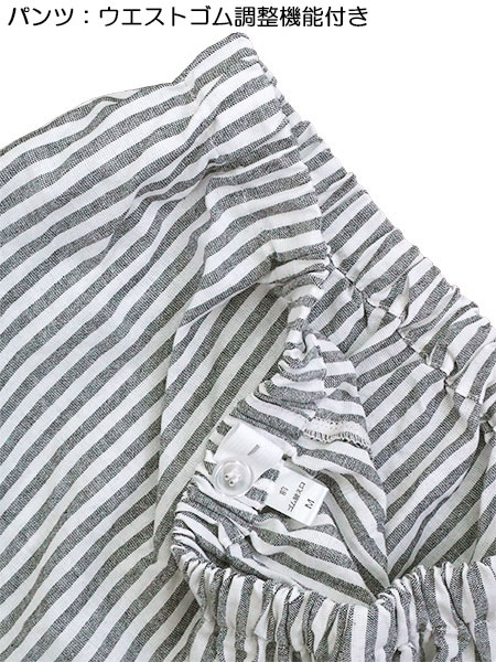 パンツ:裾ストレート、ポケットなし、ウエストゴム調整機能付き、ウエストゴム取り替え口付き。