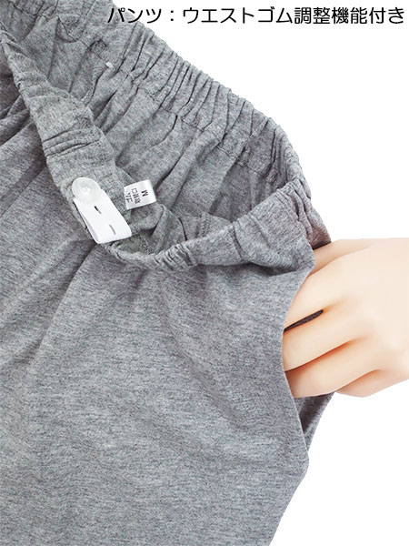 パンツ:ストレートタイプ、両サイドにポケット付き、ウエストゴム調整機能付き、ウエストゴム取り替え口付き。