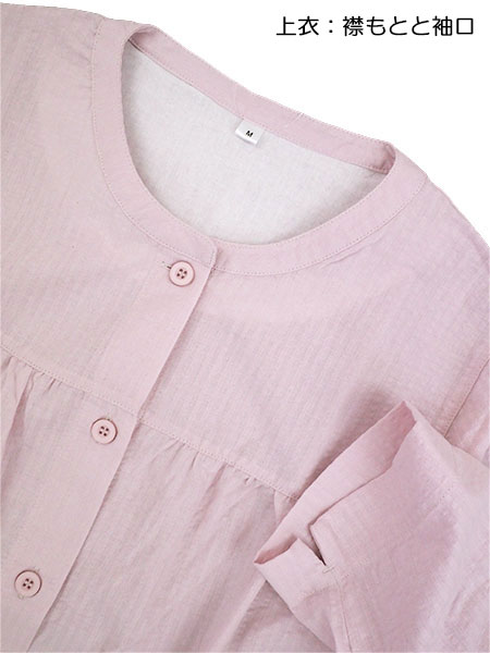 上衣:丸首、前あき、7分袖、右前ポケット付き、袖口に長さ約2.5cmのスリット入り、前身ヨーク切替ギャザーあり。