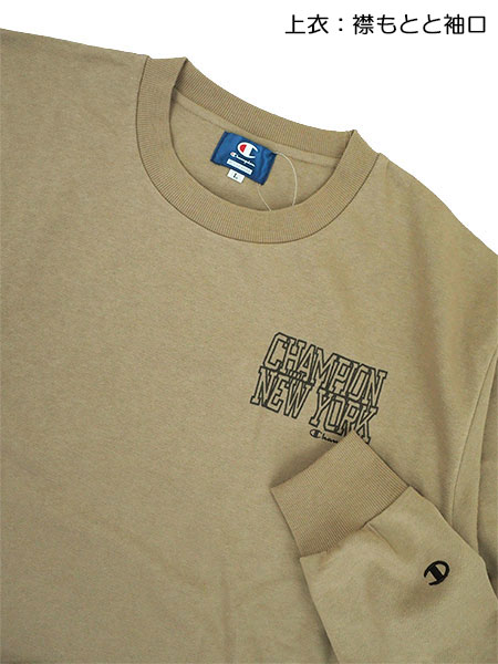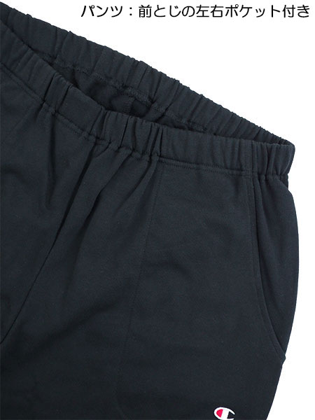 トップスの左胸にブランドロゴプリント、左袖部分とパンツの左ポケット下にチャンピオンマークの刺繍があります。