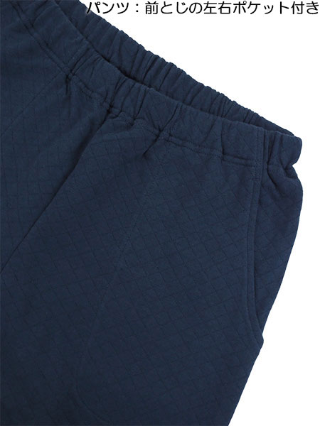 パンツ:前とじ、裾ゴム入り、両サイドにポケット付き、ウエストゴム取り替え口付き。