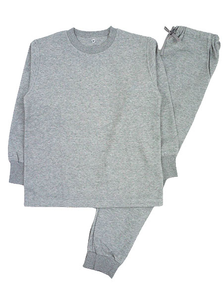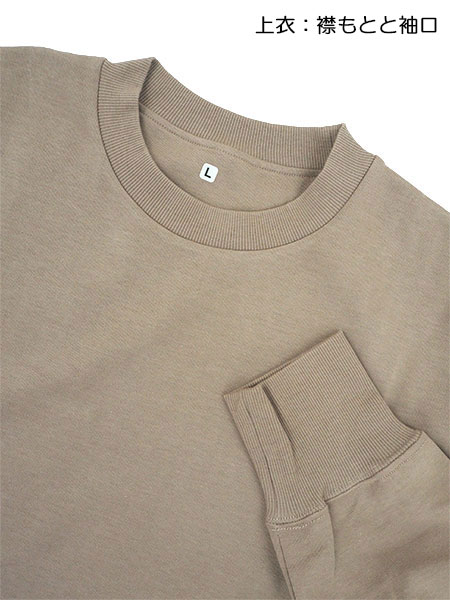上衣:丸首、首周り・袖口がリブ仕様、後ろ身頃にライナー付き・かぶりタイプ