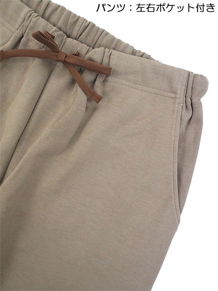 パンツ:ウエスト紐付き、両サイドにポケット付き、裾口リブ仕様、ウエストゴム取り替え口付き。