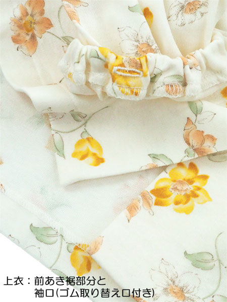上衣:前あき、袖口ゴム絞り、ポケットなし。