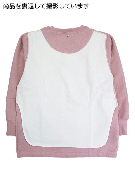 上衣:かぶりタイプ、襟周りと袖口リブ、背中にニットガーゼの重ね布付き、ポケットなし。