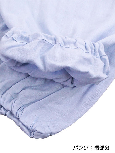 パンツ:裾ゴム絞り仕様(取替口付きで取り外し可)、ポケットなし、ウエストゴム取り替え口付き。