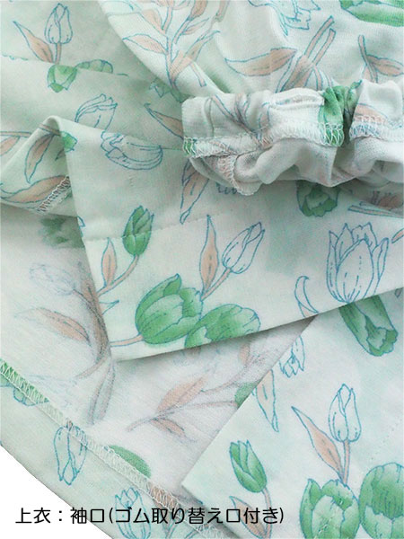 上衣:前あき、袖口ゴム絞り、ポケットなし。