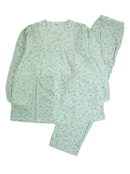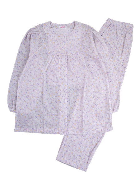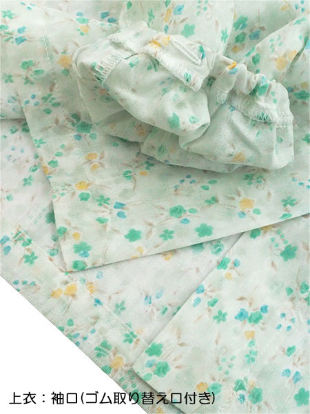 花柄プリント。袖・足口部分にゴム通し穴付き。
