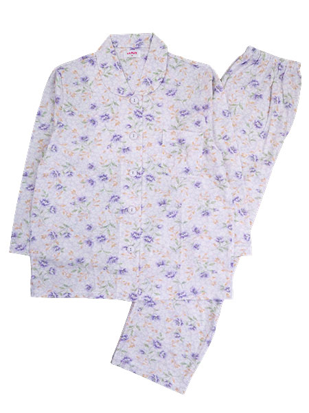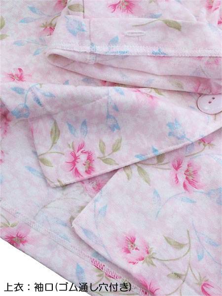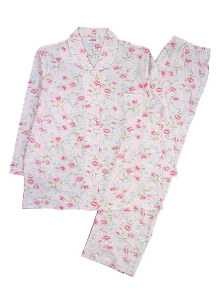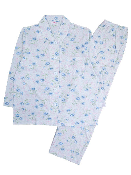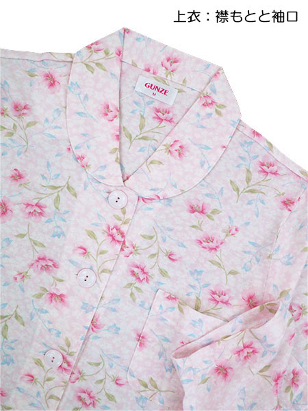グンゼ 婦人長袖・長パンツパジャマ 大きめ釦 京都捺染 綿100% 天竺 襟付き 花柄