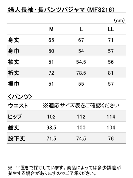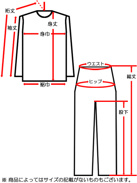 パンツ:無地、裾ストレート、両サイドにポケット付き、ウエストゴム取り替え口付き。
