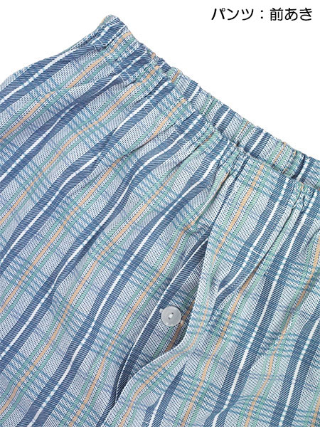 パンツ:前あき、ポケットなし、ウエストゴム取替口あり。