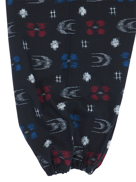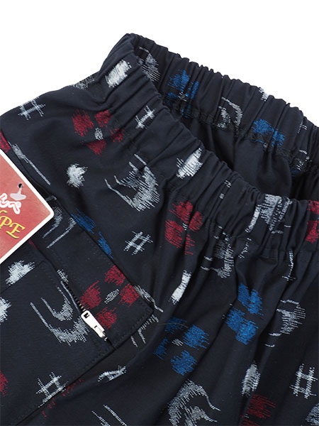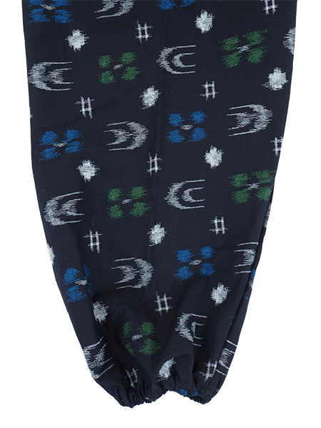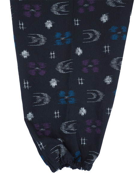 ウエスト総ゴム、さらっとした生地感、趣味の藍調、伝統の柄ゆきが懐かしいもんぺです。