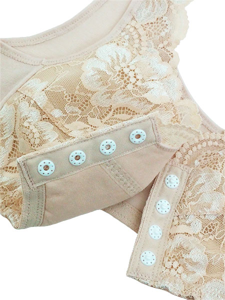 前側がスナップボタンの前開きで、後ろに手をまわさなくても着脱ができて楽。