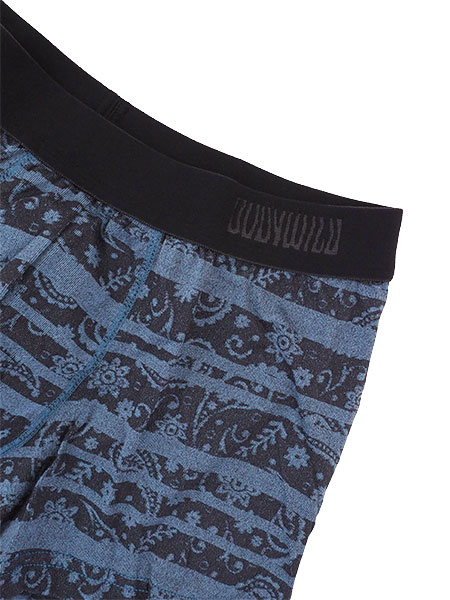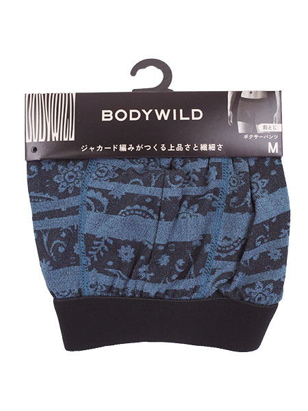 グンゼ、ボディワイルドのメンズボクサーパンツ前とじ、ペイズリー柄、ジャガード編み。