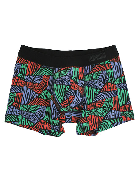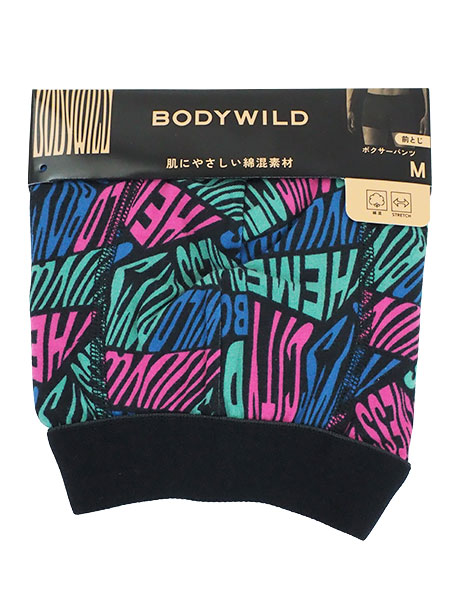 BODYWILDなどの英字が流れるように配置された粋なデザインのボクサー。