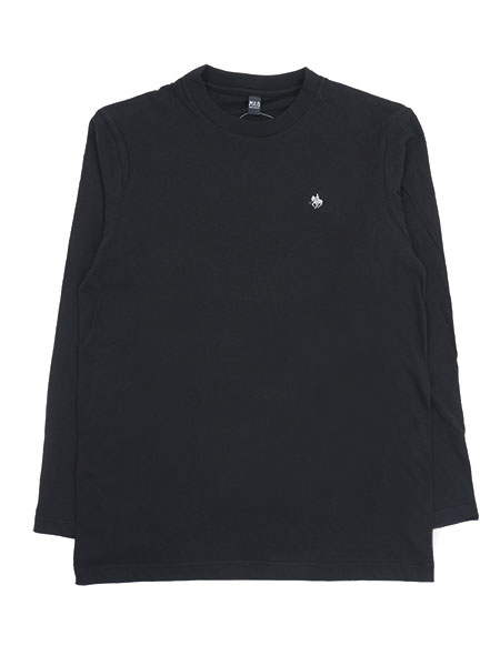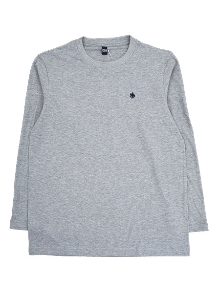 左胸にロゴマーク刺繍付きのクルーネック長袖カジュアルシャツ。